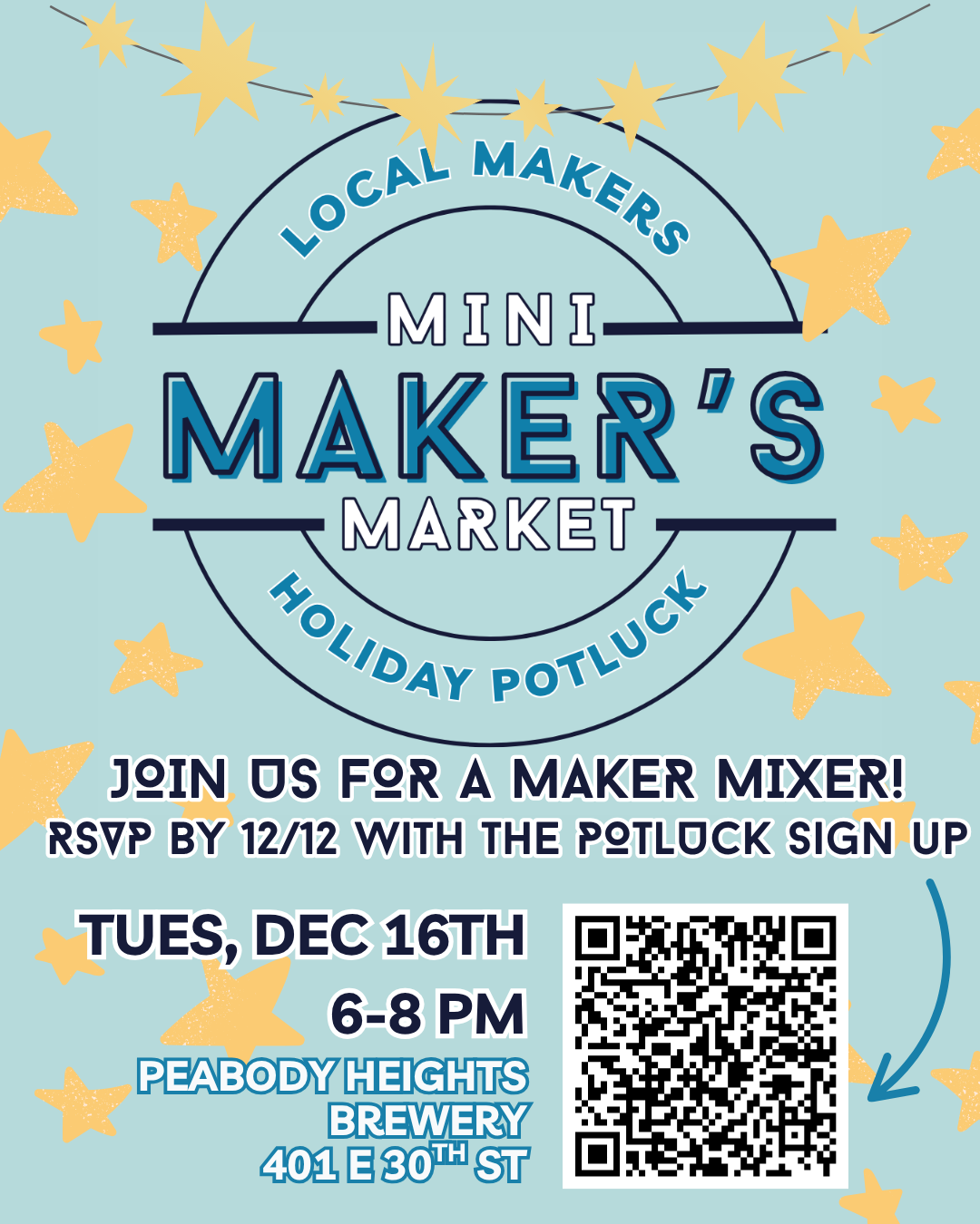 Sign Up HereJoin us at Peabody Heights Brewery for a social potluck for local makers! Make sure to RSVP on the sign up sheet by 12/12.