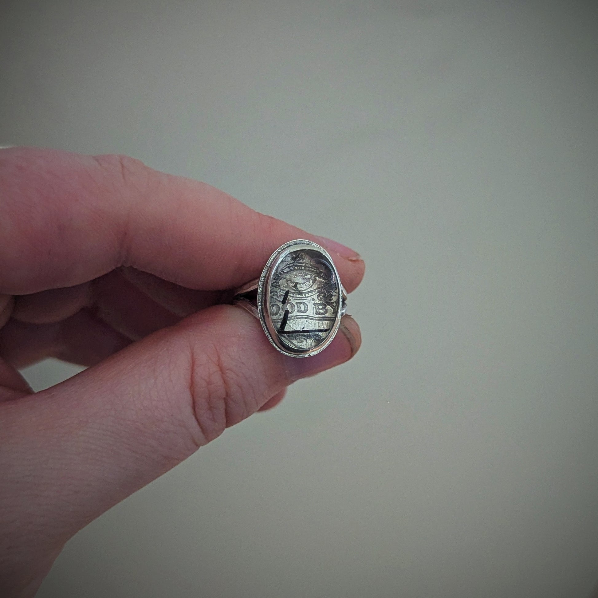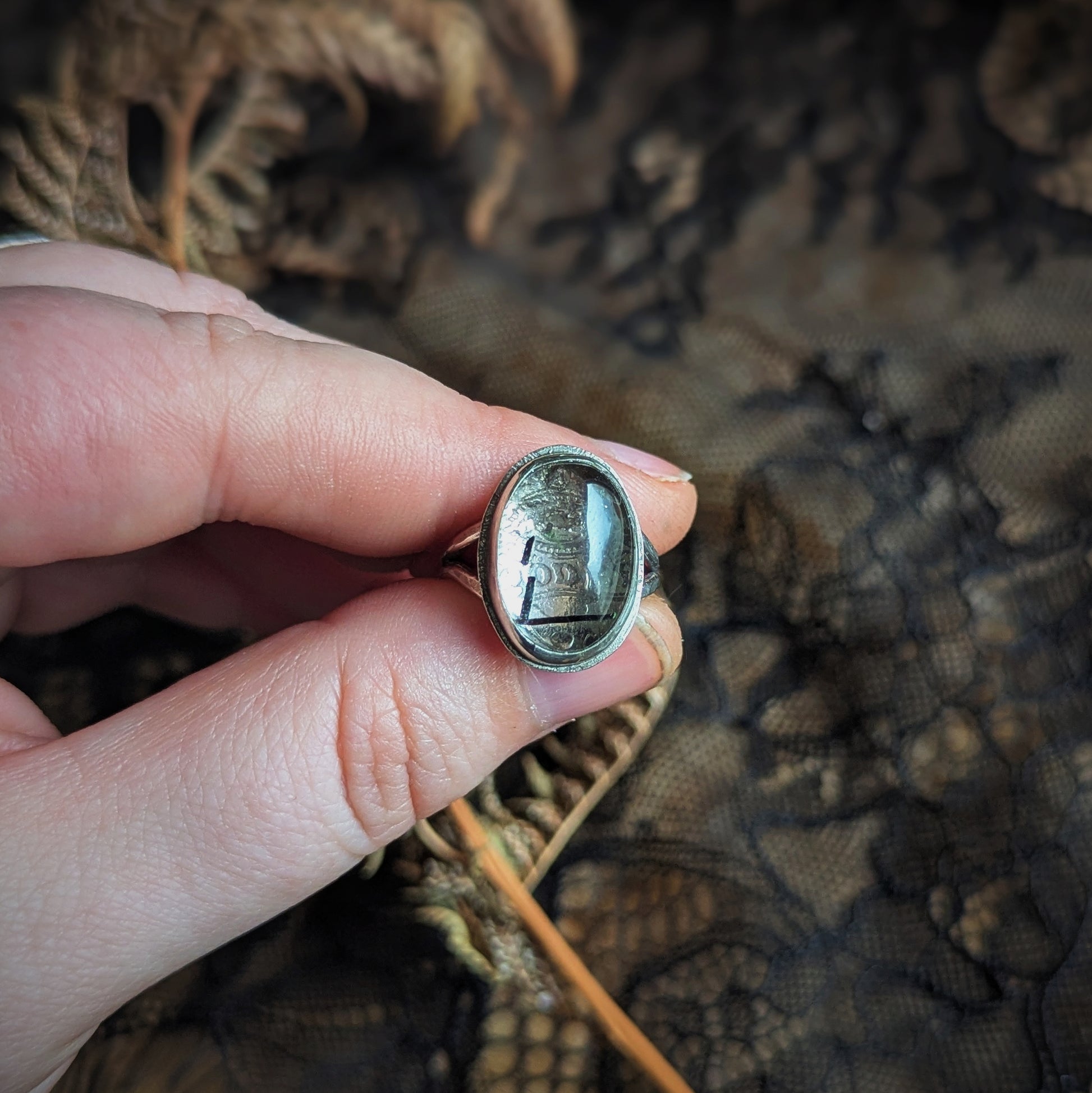 This captivating ring features a luminous rutilated quartz oval stone set in sterling silver, showcasing an enchanting secret eye design etched into the backplate that peeks through the gem. The delicate detailing reveals itself as light catches the stone, creating an intriguing visual element that speaks to mindful craftsmanship. Perfect for those drawn to symbolic jewelry and the clarifying energy of quartz, this piece celebrates the beauty of individually created designs with meaningful details. Each ring is uniquely handcrafted and cannot be resized.