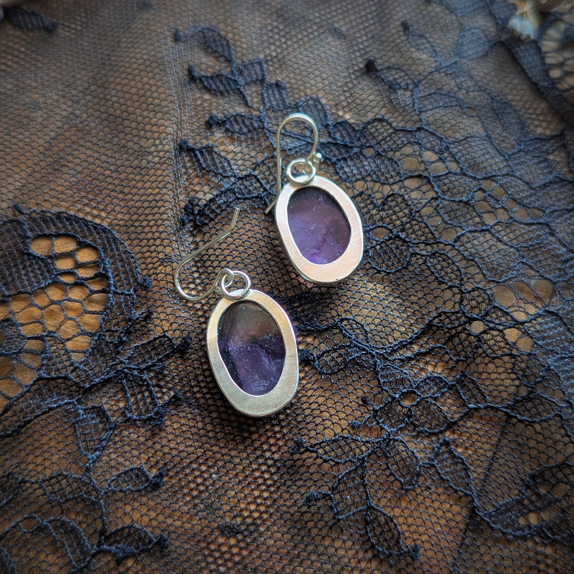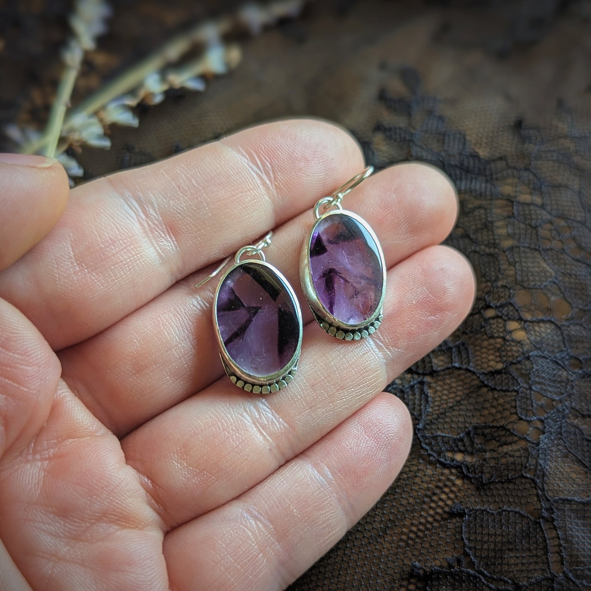 Discover hidden beauty with these Amethyst Window Earrings. Each earring features a stunning two-tone amethyst stone with an ingenious oval window cut into the back of the setting, allowing light to pass through and reveal the stone's inner depths. A delicate beaded border frames the bottom of the gem, adding refined detail and visual interest. Crafted in sterling silver with matching hooks, these earrings offer a fresh perspective on amethyst's natural elegance—perfect for those who appreciate innovative design and want jewelry that invites closer inspection.