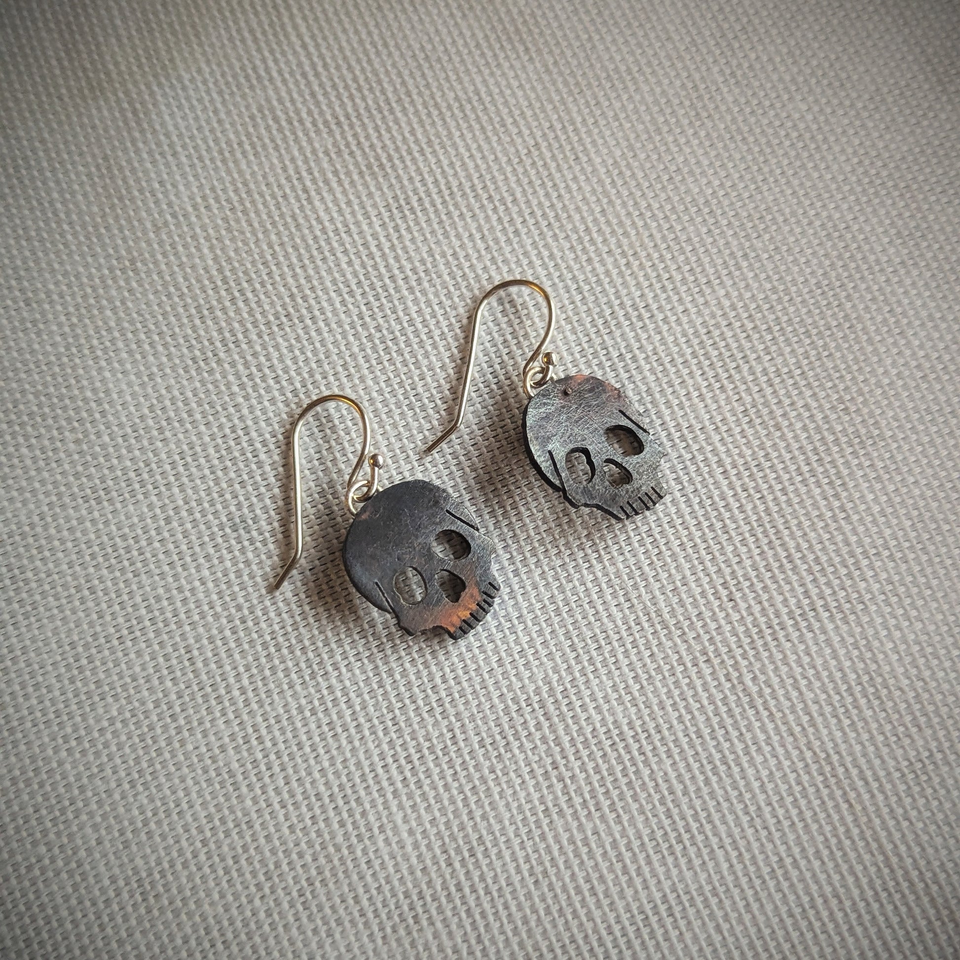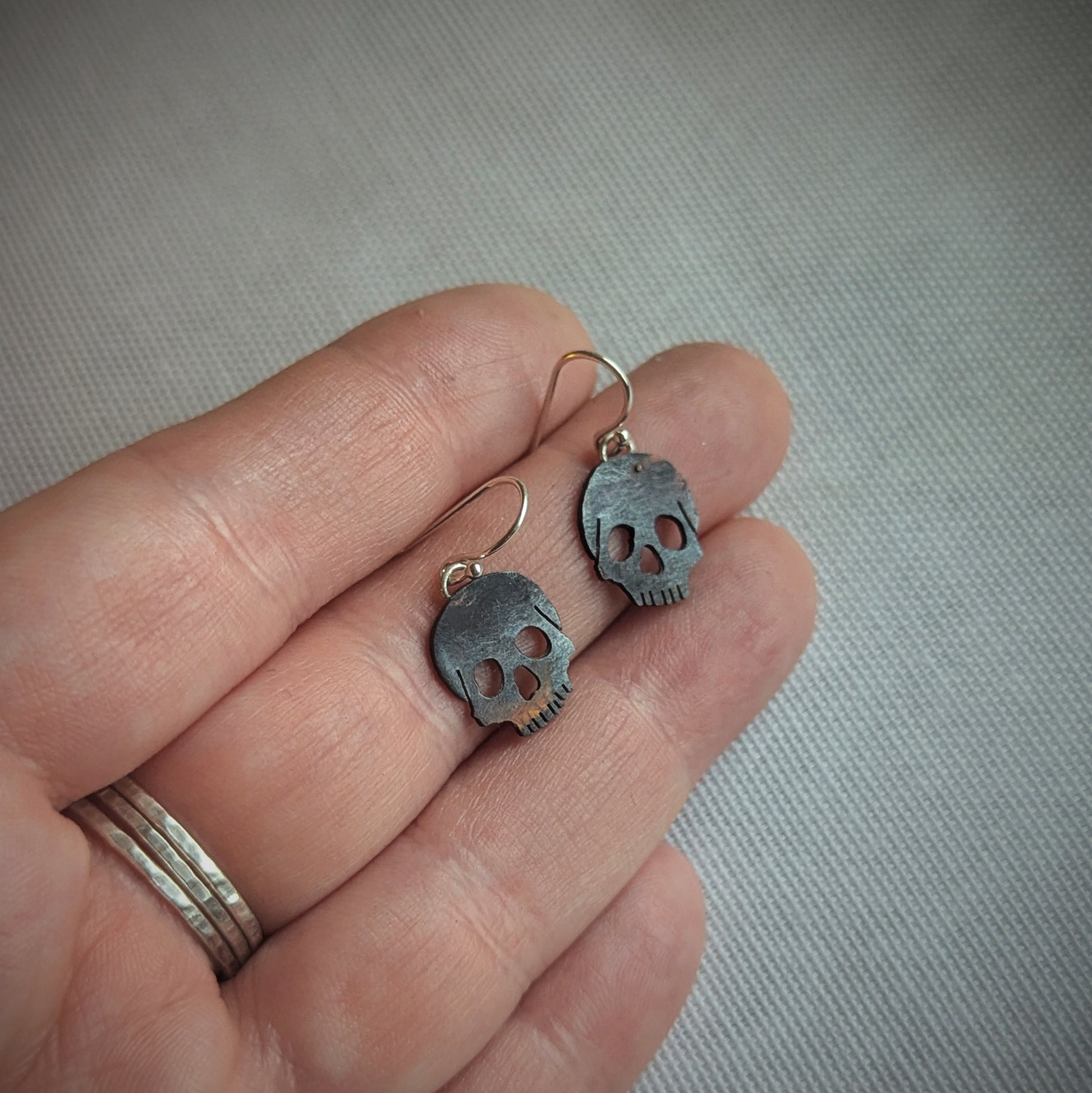 Make a bold statement with these Skull Earrings, where intricate artistry meets edgy style. Each pair features hand-pierced skull designs meticulously crafted from oxidized copper sheet metal using traditional jeweler's techniques. The artist carefully sands and solders every detail, creating a refined finish that elevates these pieces beyond typical novelty jewelry. At approximately 1/2 inch tall, they're the perfect size to command attention without overwhelming your look. Whether you're channeling Halloween spirit, embracing gothic aesthetics, or simply love jewelry with personality, these earrings deliver attitude and craftsmanship in equal measure. Earring hooks are sterling silver.
