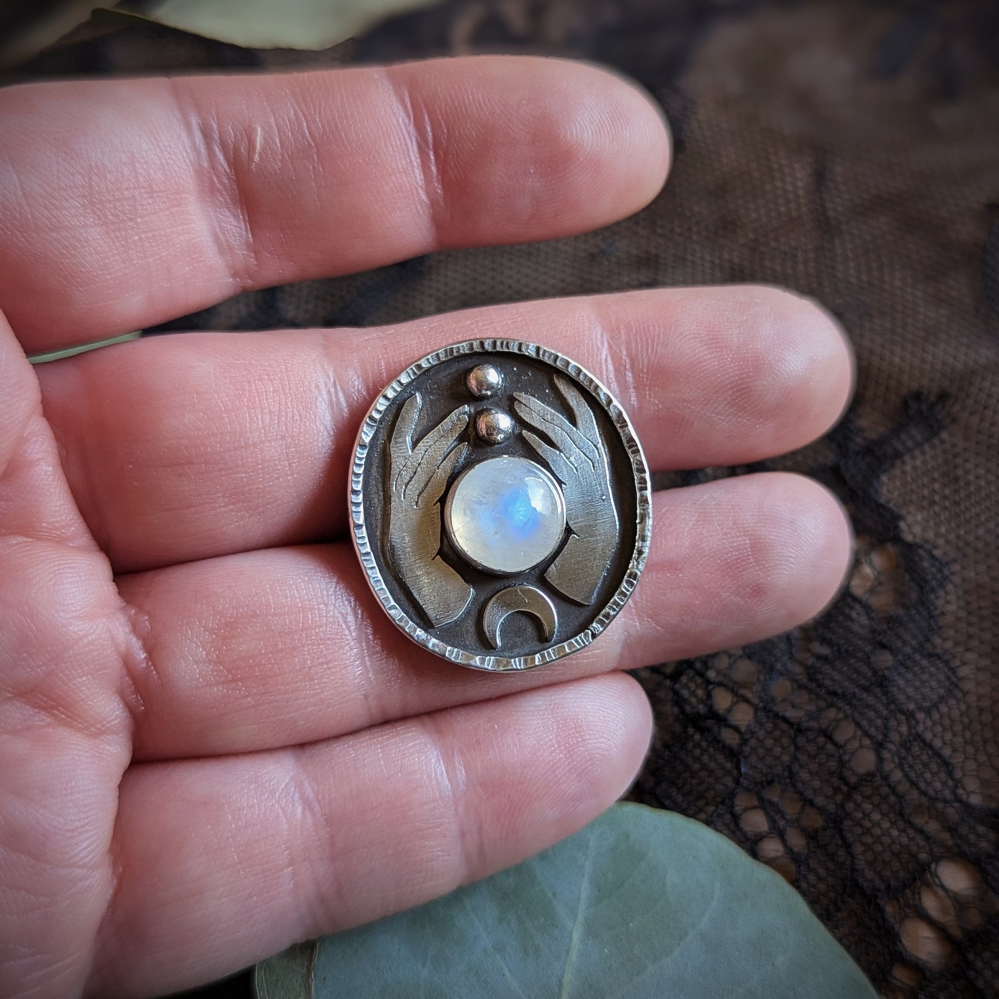 This enchanting ring captures the mystique of a crystal ball, featuring a luminous moonstone that seems to hold secrets within its pearlescent glow. Hand-saw pierced details showcase meticulous artisanal work, while a hammered silver border frames the stone with organic texture and movement. A delicate crescent moon is soldered to the backplate, adding celestial symbolism that speaks to intuition and inner wisdom. Each element is thoughtfully crafted to honor the stone's natural beauty and metaphysical allure. Ideal for those who appreciate handmade jewelry with intention and meaning. This ring is a size 7 and cannot be resized.