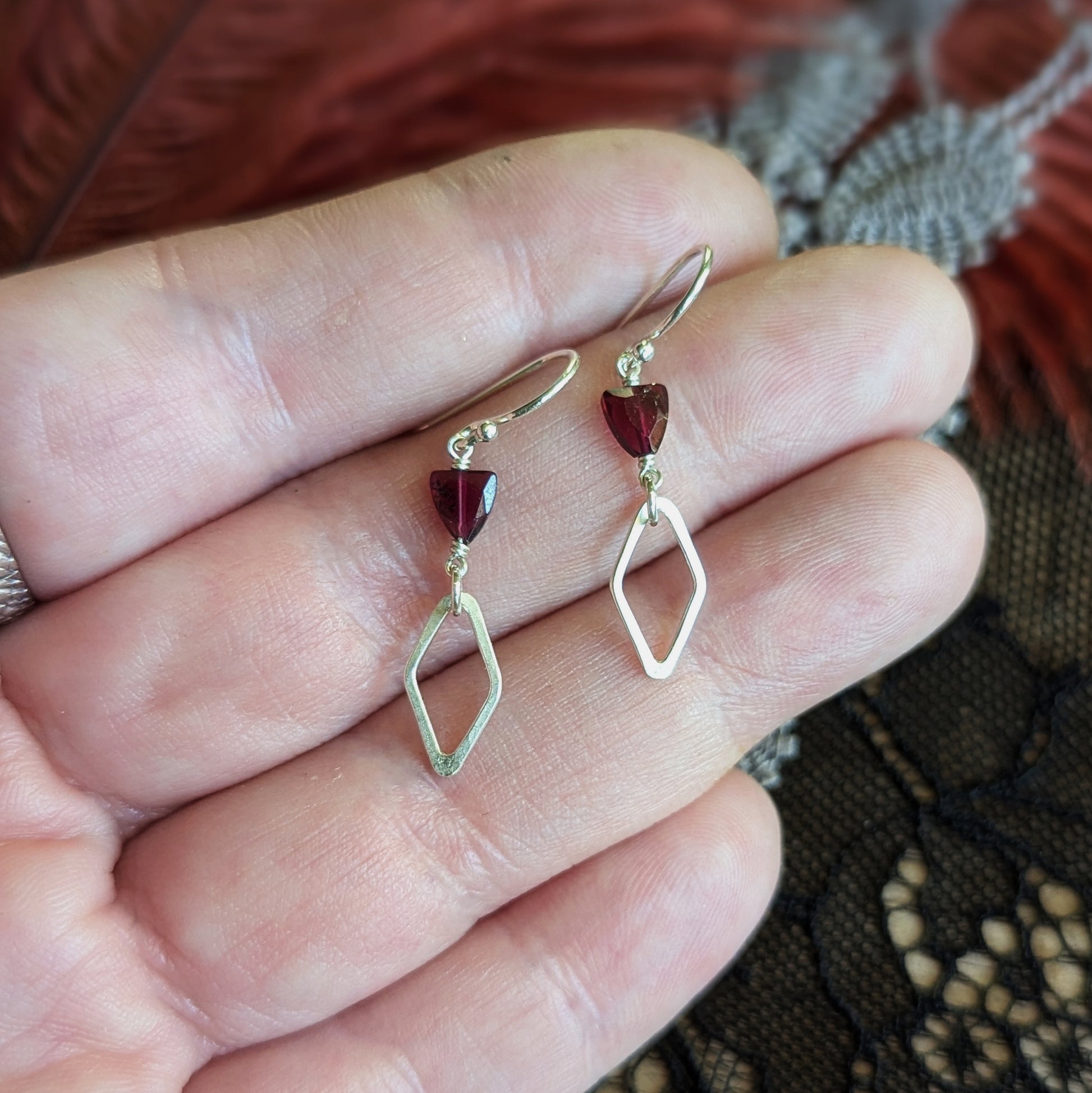 Ignite your inner fire with these Garnet Diamond Earrings, where deep crimson gemstones meet refined silver craftsmanship. Vibrant garnet stones are paired with delicate hammered silver diamond-shaped settings, creating an elegant interplay of texture and polish. Garnet is celebrated for its connection to passion, vitality, and creative energy, while also offering grounding properties that promote emotional stability. Suspended on graceful sterling silver hooks, these lightweight earrings add just the right amount of sparkle and movement to any look. Versatile enough for everyday wear yet meaningful enough for special occasions, they bring both timeless beauty and positive energy to your collection.
