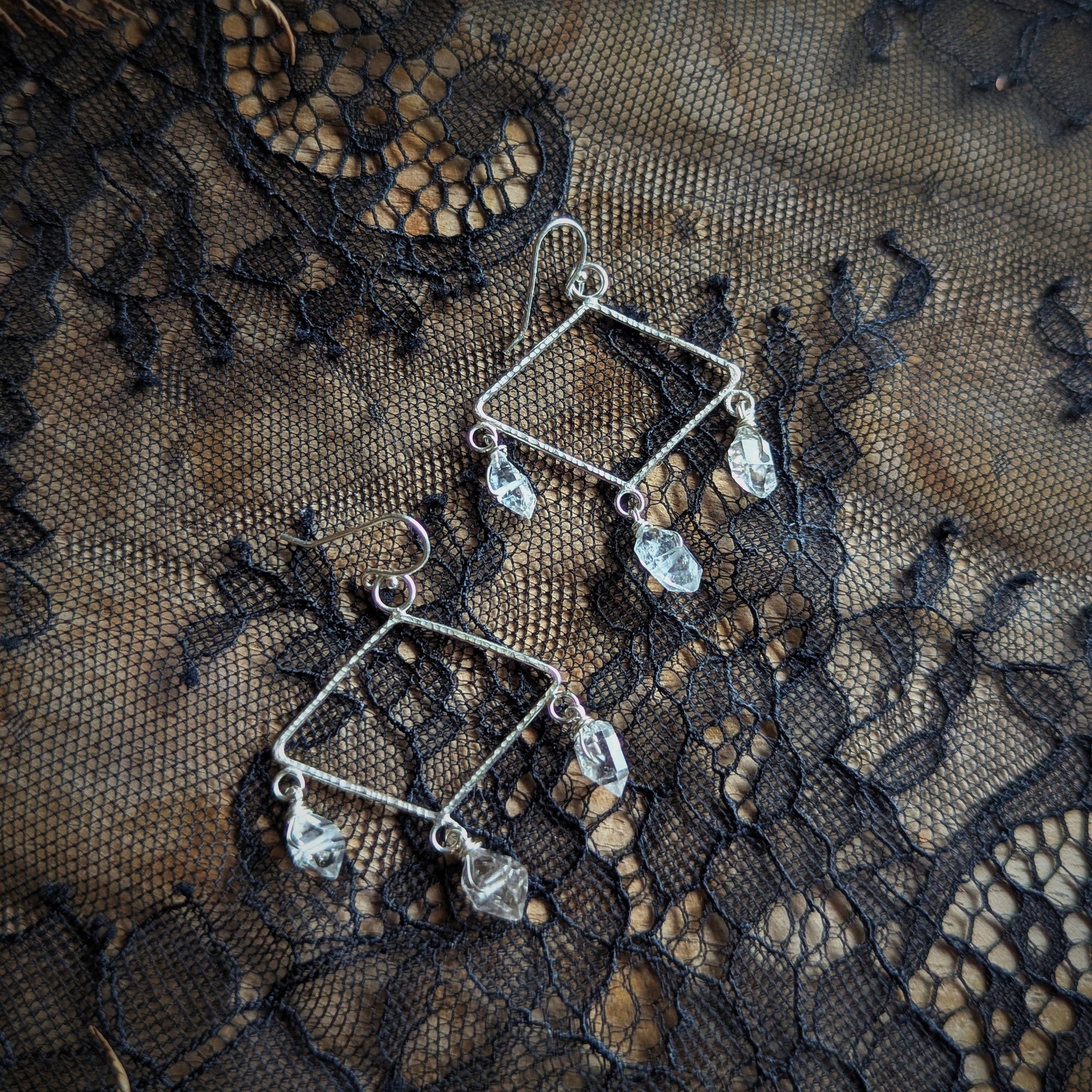These stunning chandelier earrings showcase genuine Herkimer diamonds that catch and reflect light beautifully with every movement. The cascading design creates an eye-catching statement piece perfect for elevating any outfit, whether you're heading to a special event or adding sparkle to your everyday look. Each earring features the natural brilliance of these precious quartz crystals, making them a timeless accessory that combines elegance with geological beauty. A conversation starter that brings sophistication and shimmer to your jewelry collection.