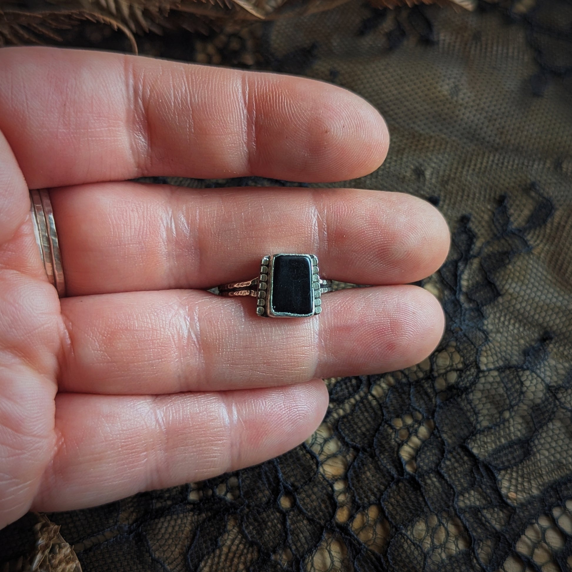 This singular ring features a striking black jet stone cut into a sleek rectangular form, set in sterling silver with refined sophistication. Delicate beaded embellishments line both sides of the stone, adding an artisanal dimension that enhances its natural allure. Every detail showcases thoughtful craftsmanship and a deep appreciation for the materials at hand. Ideal for those drawn to the protective energy of jet and the charm of individually designed, handcrafted jewelry. This ring is a size 8 and cannot be resized.