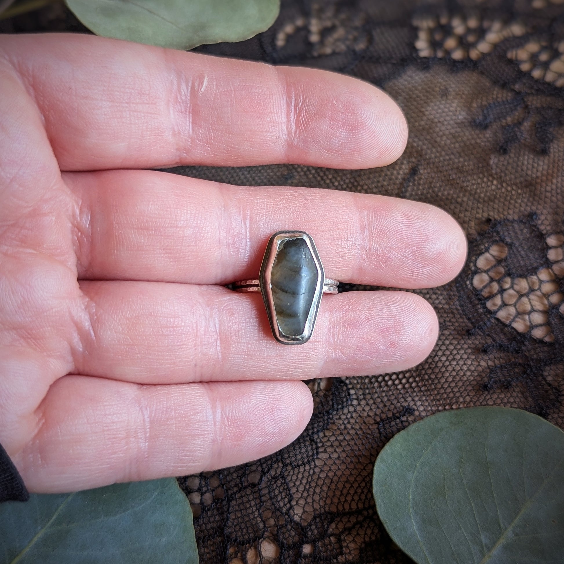 This distinctive ring showcases a hand-cut labradorite stone in a striking coffin shape, nestled in sterling silver for timeless appeal. Delicate silver bubble accents surround the gem, adding an artisanal flair that honors its natural character and unique play of light. Every element speaks to thoughtful craftsmanship and a genuine appreciation for raw, authentic materials. Ideal for those who resonate with labradorite's transformative energy and value one-of-a-kind, individually made pieces. This ring is a size 6.5 and cannot be resized.