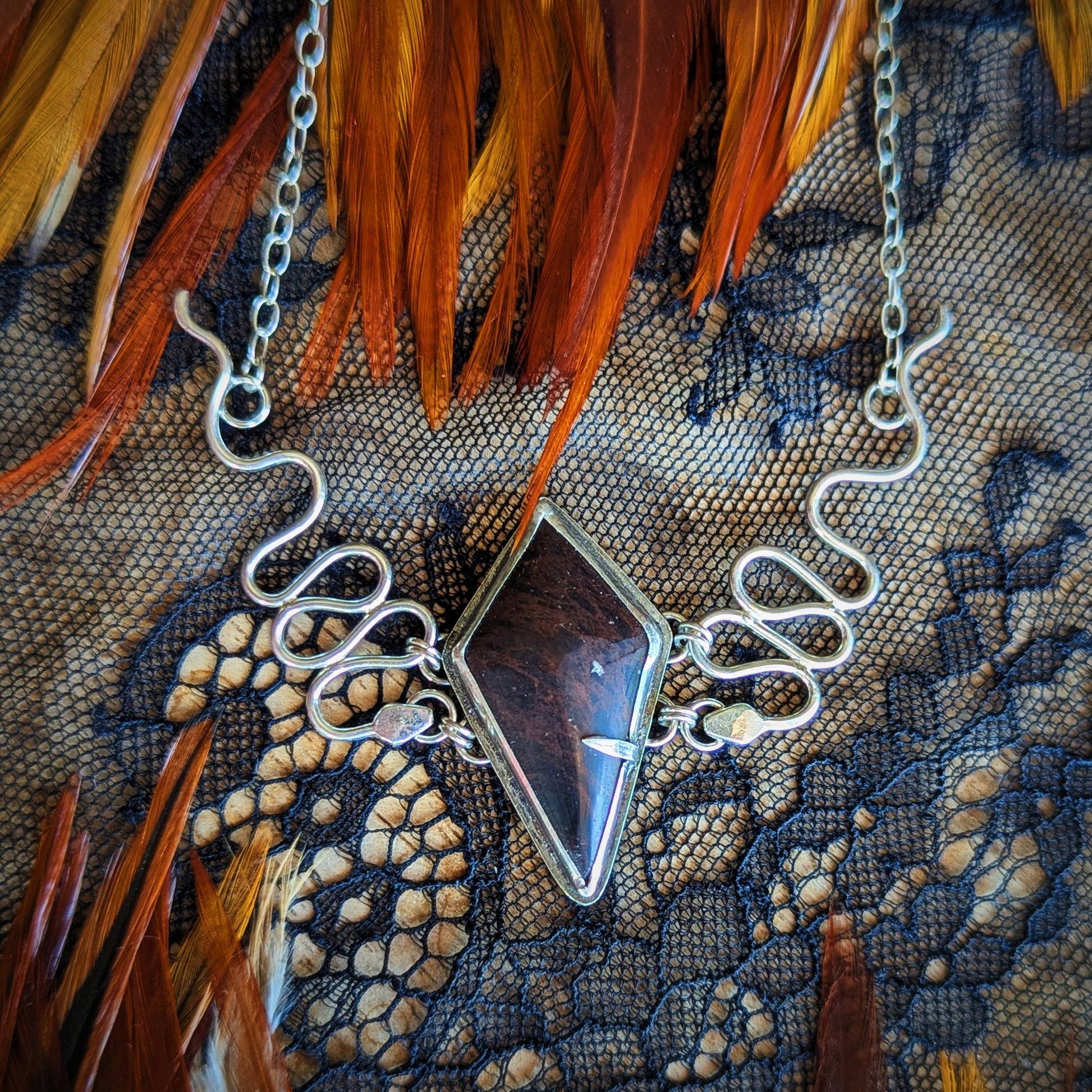 Command attention with this Mahogany Obsidian Serpent Crown Necklace, a true witchy statement piece. The centerpiece features a hand-cut kite-shaped mahogany obsidian stone set in sterling silver with a secure bezel setting. Handmade serpents frame the stone on either side, creating a regal crown effect that exudes power, mystery, and dark magic. At 18 inches in length, this necklace sits perfectly on the collarbone, making it an ideal focal point for any outfit. Perfect for those who embrace bold, alternative style and aren't afraid to channel their inner witch with jewelry that celebrates the supernatural and mystical.