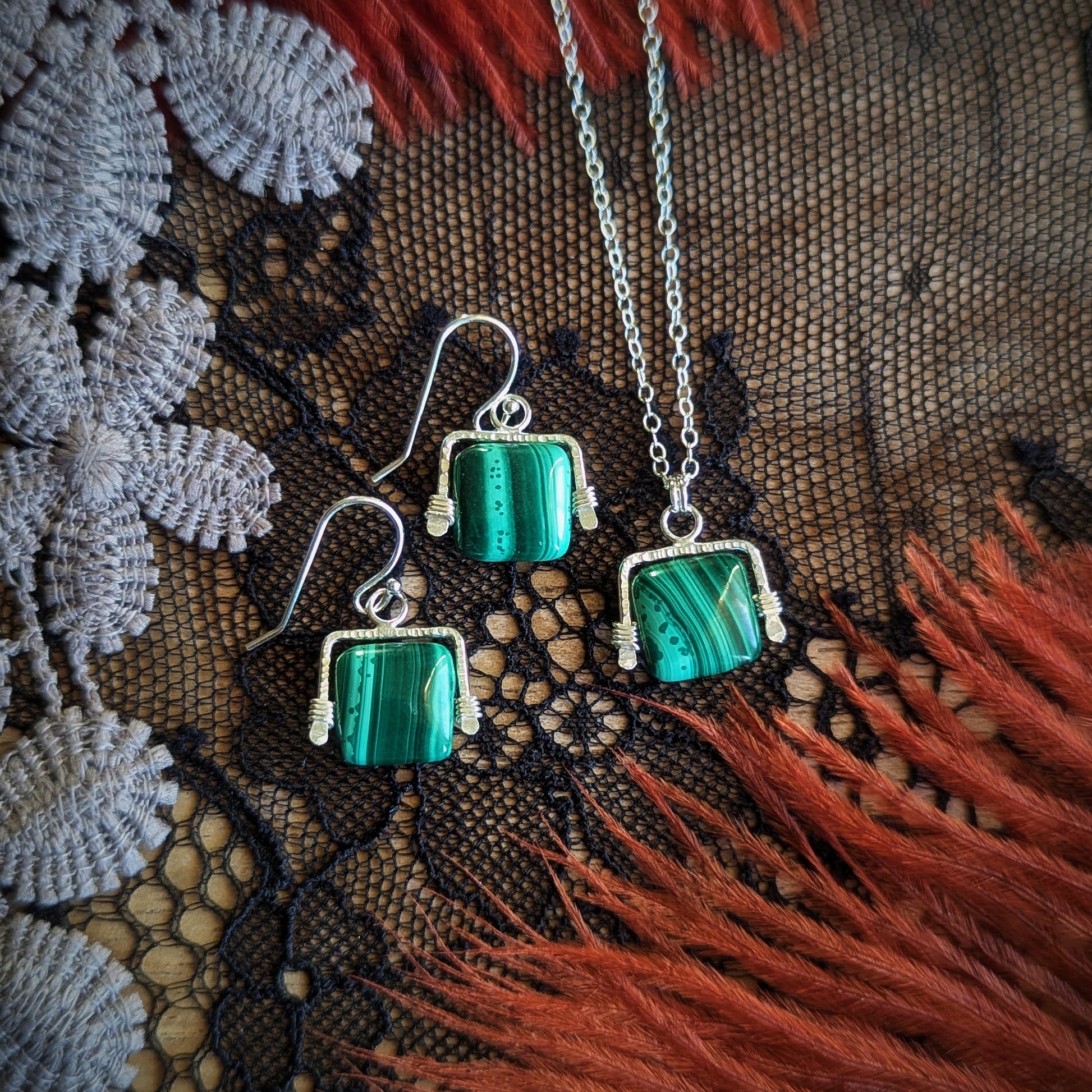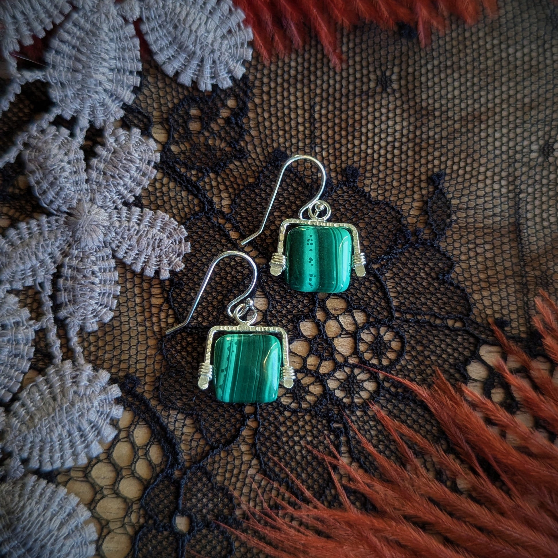 Adorn yourself with natural beauty and positive energy through these Malachite Stripe Earrings. Each pair showcases small malachite stones with their signature rich green banding and mesmerizing swirling patterns, framed by hand-hammered silver components that add texture and visual depth. Malachite is treasured as a stone of transformation, believed to offer protection and emotional balance while promoting personal growth. The textured silver setting complements the stone's natural vibrancy, creating an elegant contrast that works beautifully for both everyday moments and special occasions. Perfect for those seeking jewelry that combines aesthetic appeal with meaningful gemstone energy.