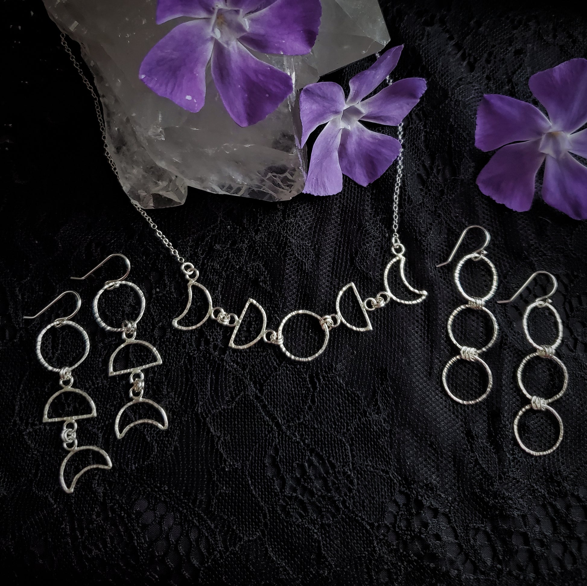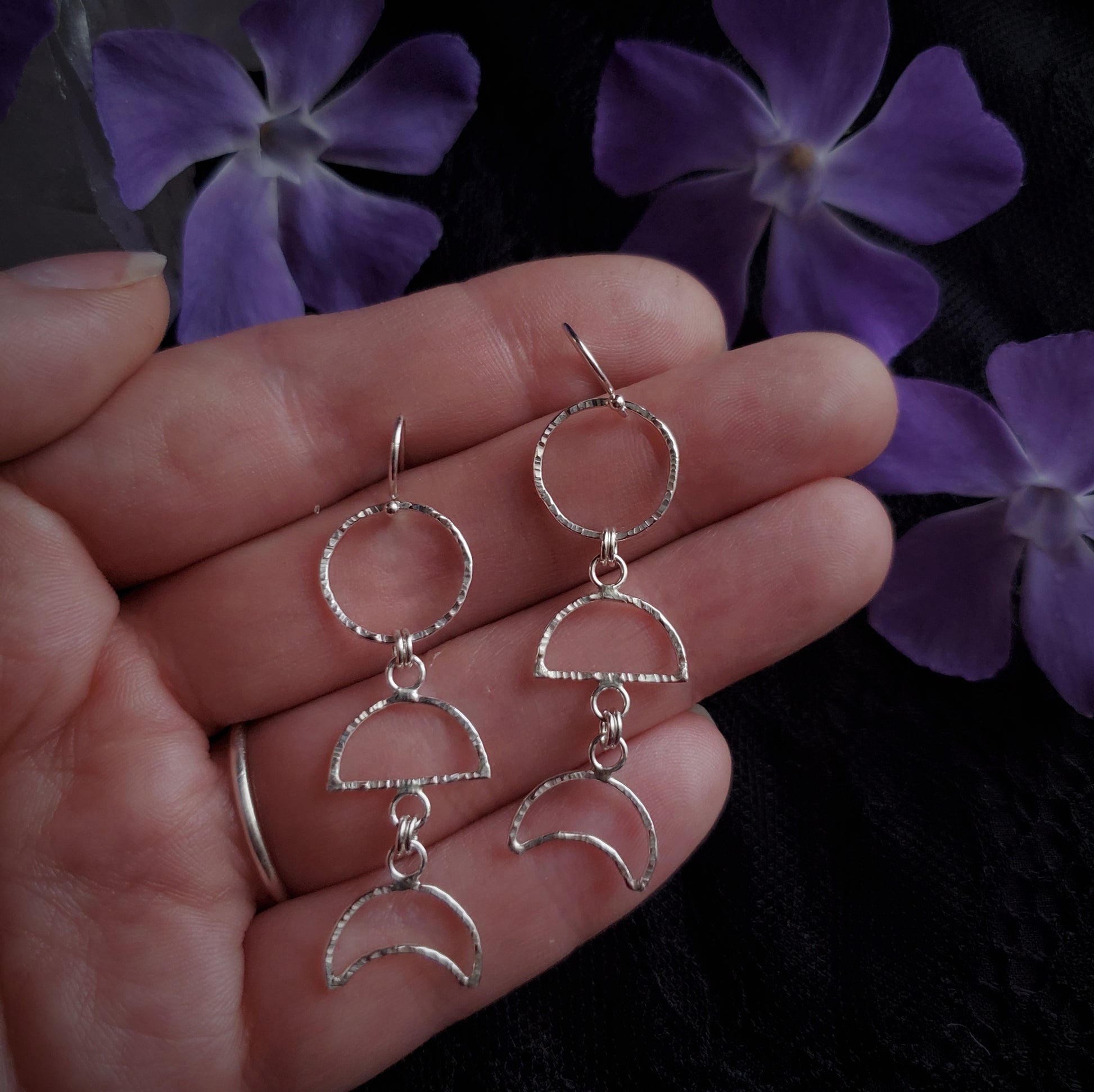 Celebrate lunar cycles with these Moon Phase Earrings. Crafted entirely from sterling silver and hand-finished with care, these lightweight earrings capture the beauty of the moon's celestial journey. The elegant design works seamlessly with any outfit or occasion, from casual everyday wear to special events. Hanging approximately 1 1/2 inches from sterling silver hooks, these earrings offer comfortable, secure wear with beautiful movement. Perfect for moon lovers and anyone drawn to celestial symbolism and handcrafted artistry.
