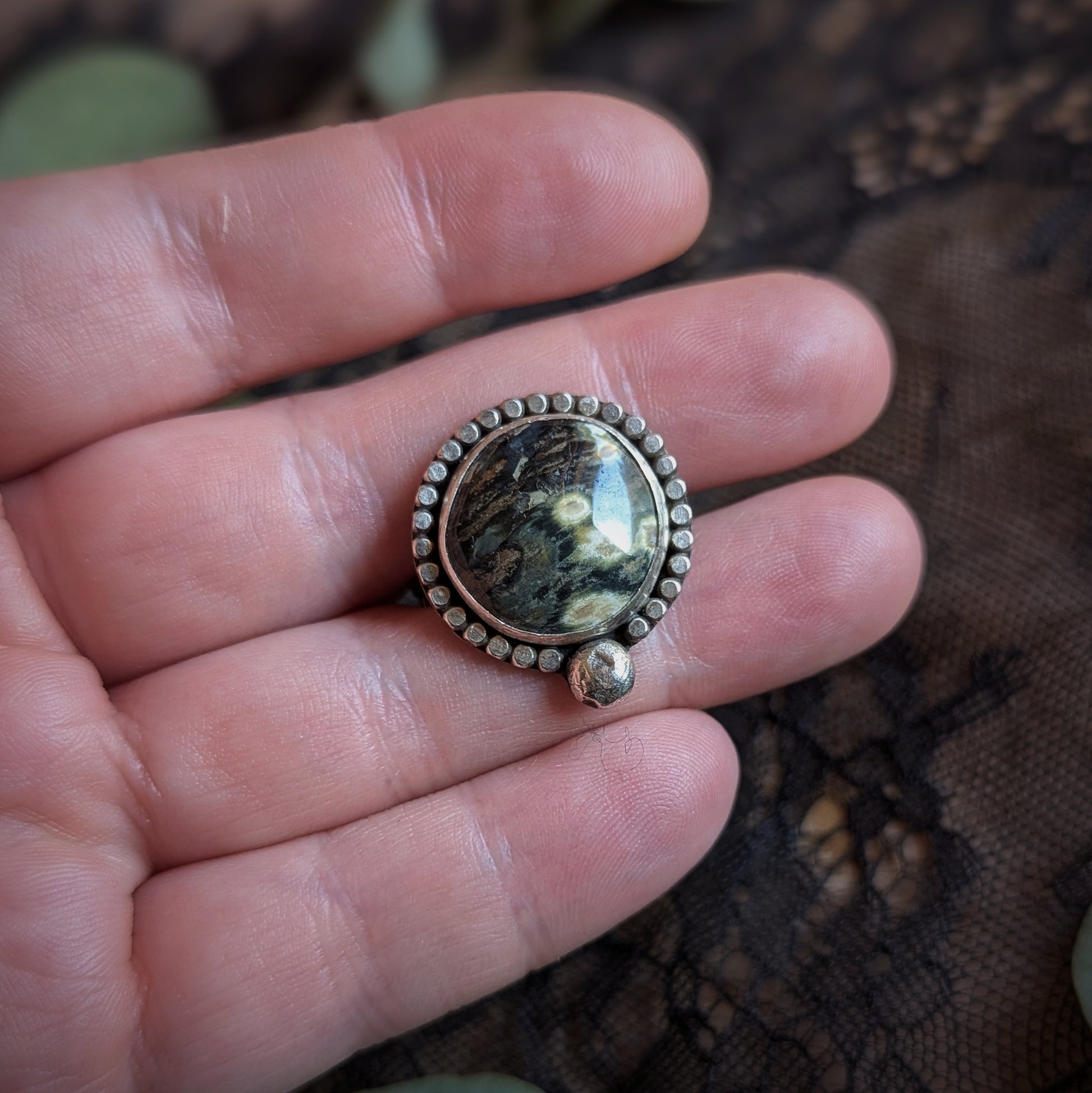 This captivating ring showcases a serene ocean jasper stone in soft, neutral green tones, nestled in sterling silver with graceful sophistication. A beaded border cradles the gem while a prominent silver bubble anchors the design at the base, creating a distinctive halo effect. Every element demonstrates skilled artisanship and a genuine appreciation for the stone's calming, natural character. Ideal for those who resonate with ocean jasper's grounding, peaceful energy and treasure the authenticity of individually handcrafted jewelry. This ring is a size 10 and cannot be resized.