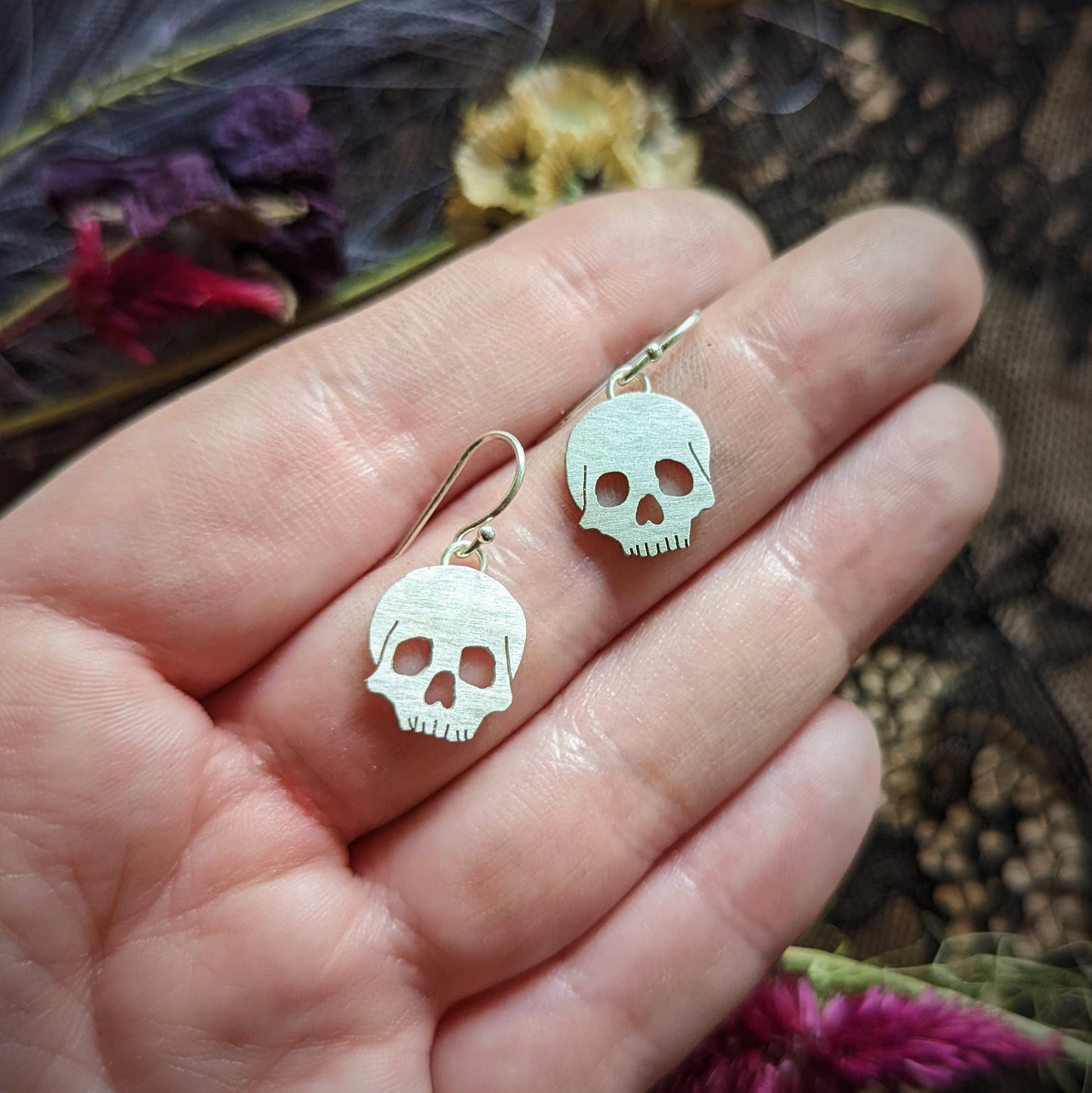 Make a bold statement with these Skull Earrings, where intricate artistry meets edgy style. Each pair features hand-pierced skull designs meticulously crafted from solid sterling silver sheet metal using traditional jeweler's techniques. The artist carefully sands and solders every detail, creating a refined finish that elevates these pieces beyond typical novelty jewelry. At approximately 1/2 inch tall, they're the perfect size to command attention without overwhelming your look. Whether you're channeling Halloween spirit, embracing gothic aesthetics, or simply love jewelry with personality, these earrings deliver attitude and craftsmanship in equal measure.