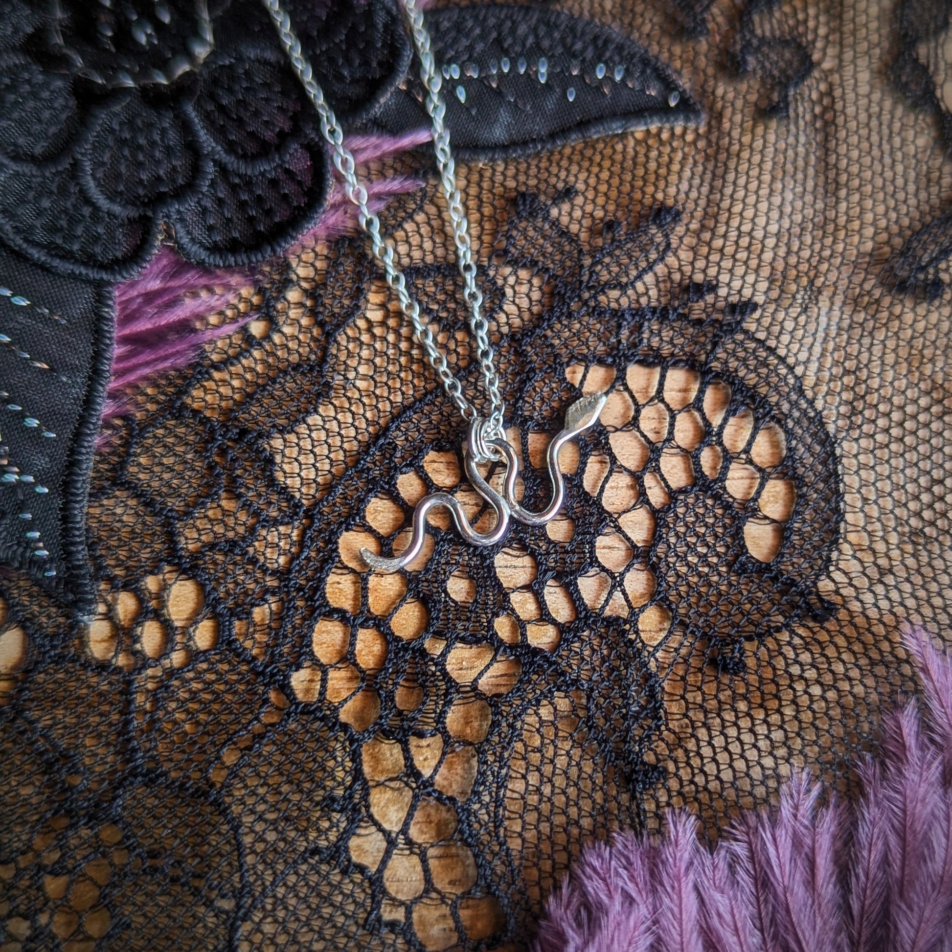 Embrace your wild side with this Snake Necklace. Each pendant is expertly hand-formed, with every snake uniquely oriented to create a completely one-of-a-kind piece. The variations in design and positioning add to the charm and individuality of your necklace—making it truly special. Crafted entirely from sterling silver, this striking pendant hangs gracefully from an 18-inch sterling silver chain. Perfect for those drawn to serpent symbolism, nature-inspired jewelry, and pieces that celebrate the artistry of handcrafted metalwork. Ideal for adding an edgy, mystical touch to any outfit.