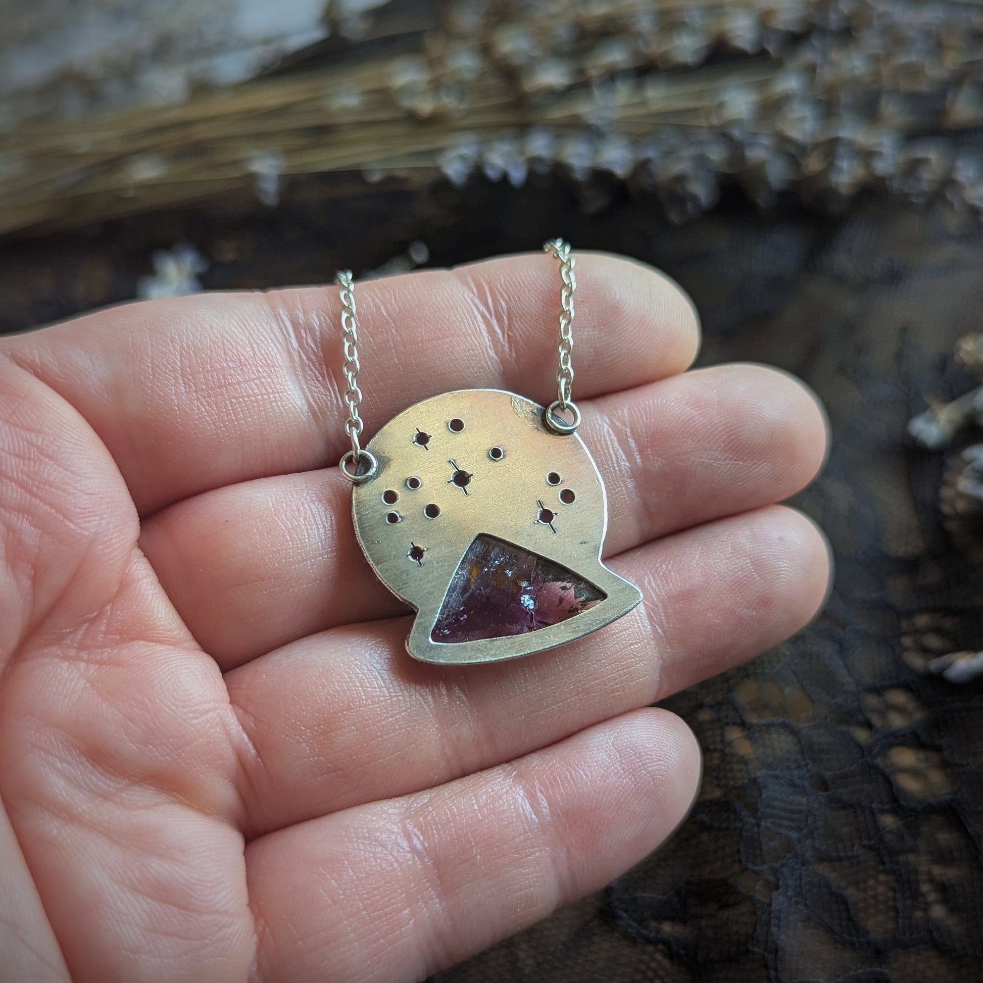 Wear a piece of the night sky with this Super Seven Mountain Moon Necklace. The stunning centerpiece showcases a super seven stone fashioned into a majestic mountain silhouette, featuring a strategic window cut-out that reveals the gem's luminous depths as light filters through. The backdrop displays an enchanting starry night scene, meticulously saw-pierced to create a celestial panorama. Surrounded by a delicate beaded border and suspended from an 18-inch sterling silver chain, this necklace is a harmonious blend of natural stone beauty and skilled metalwork. Ideal for those who find inspiration in mountains and starlight.